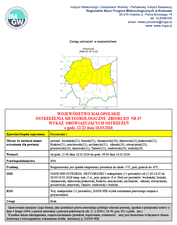 OSTRZEŻENIE METEOROLOGICZNE NR 67