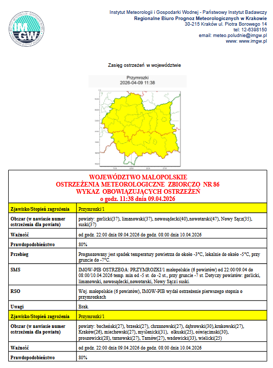 OSTRZEŻENIE METEOROLOGICZNE NR 86
