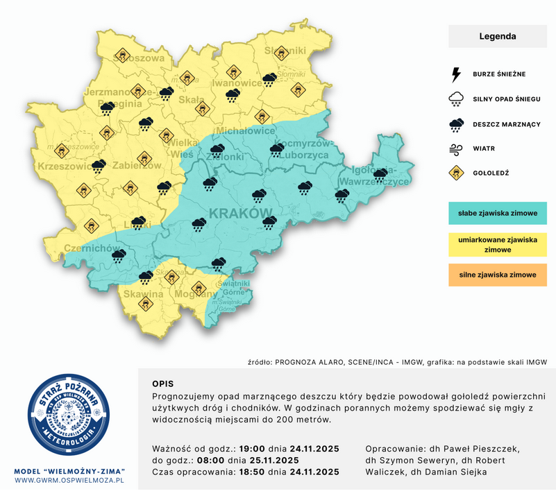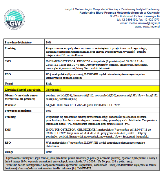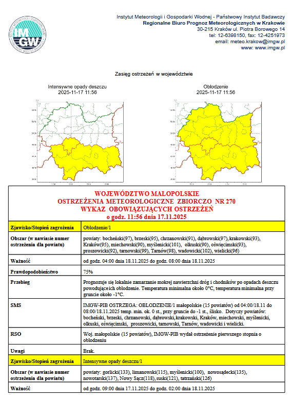 IMGW-PIB OSTRZEGA: MGŁA/1 małopolskie (14 powiatów) od 21:00/07.11 do 10:00/08.11.2025 widzialność lok. poniżej 200 m. Dotyczy powiatów: bocheński, brzeski, chrzanowski, dąbrowski, krakowski, Kraków, miechowski, olkuski, oświęcimski, proszowicki, tarnowski, Tarnów, wadowicki i wielicki. |