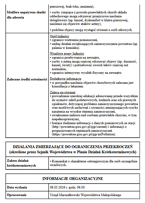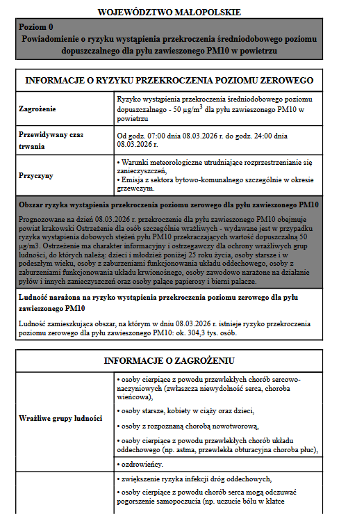Powiadomienie o ryzyku wystąpienia przekroczenia średniodobowego poziomu dopuszczalnego dla pyłu zawieszonego PM10 w powietrzu