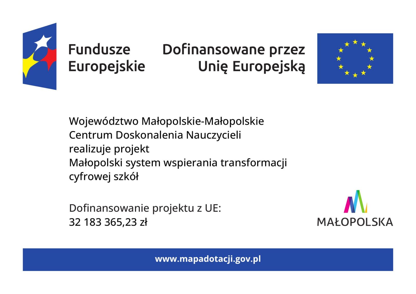 Projekt pt. „Małopolski System Wspierania Transformacji Cyfrowej Szkół” realizowany jest w ramach programu Fundusze Europejskie dla Małopolski 2021–2027, w Priorytecie 6 „Fundusze Europejskie dla rynku pracy, edukacji i włączenia społecznego”, Działaniu 6.35 „Transformacja cyfrowa szkół”, Typ projektu A – Systemowe wsparcie transformacji cyfrowej szkół. Operacja o znaczeniu strategicznym dla Małopolski.